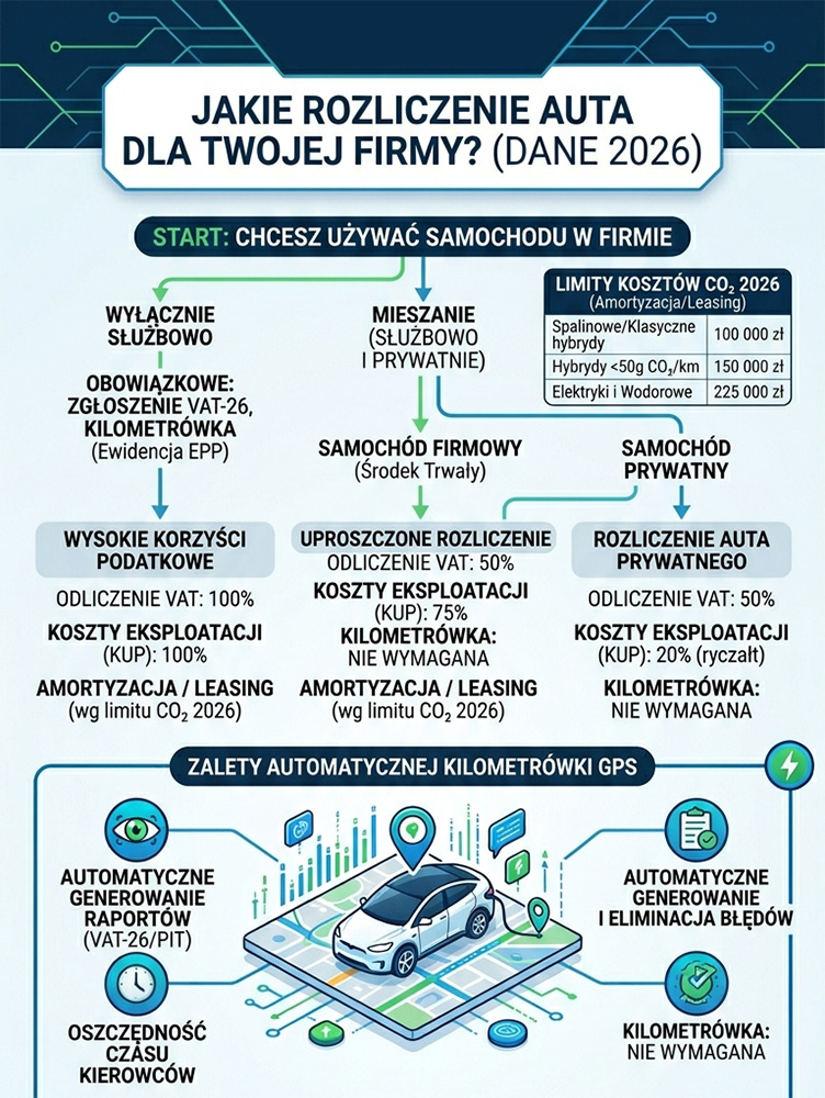 Wariant drugi to użytek wyłącznie służbowy. Tu otwiera się możliwość pełnego odliczenia – 100% VAT i 100% kosztów – ale za cenę większych wymagań formalnych. Auto musi być zgłoszone do urzędu skarbowego na druku VAT-26, a jego służbowy charakter trzeba udowodnić prowadząc na bieżąco ewidencję przebiegu pojazdu. I właśnie tu zaczyna się historia kilometrówki.