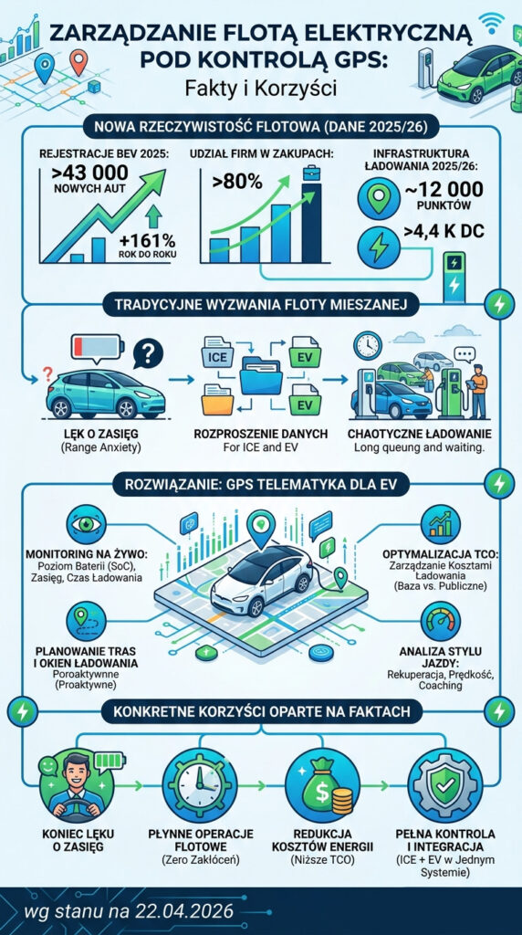 Problem w tym, że zarządzanie flotą z elektrykami rządzi się innymi prawami niż tradycyjne zarządzanie autami spalinowymi. Inne pytania, inne ryzyka, inne narzędzia. I właśnie tutaj wkracza telematyka GPS – technologia, która w erze benzyny zajmowała się głównie lokalizacją i kilometrówką, a dziś staje się centralnym układem nerwowym nowoczesnej floty elektrycznej.