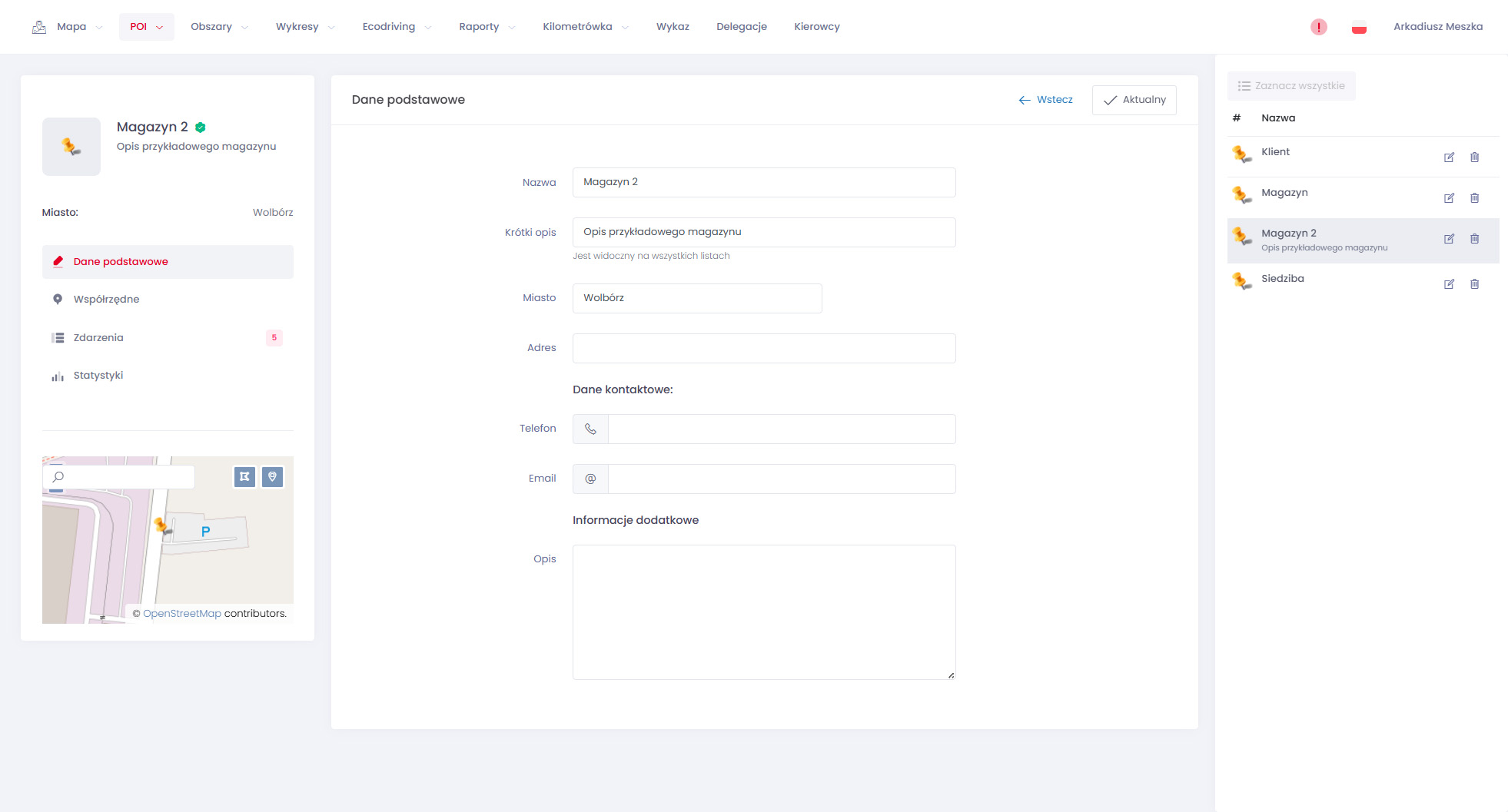 Twórz punkty POI (Points of Interest) bezpośrednio na mapie — siedziby klientów, magazyny, stacje paliw czy place budowy. Każdy punkt możesz nazwać, opisać i przypisać do kategorii, co porządkuje mapę nawet przy setkach lokalizacji.