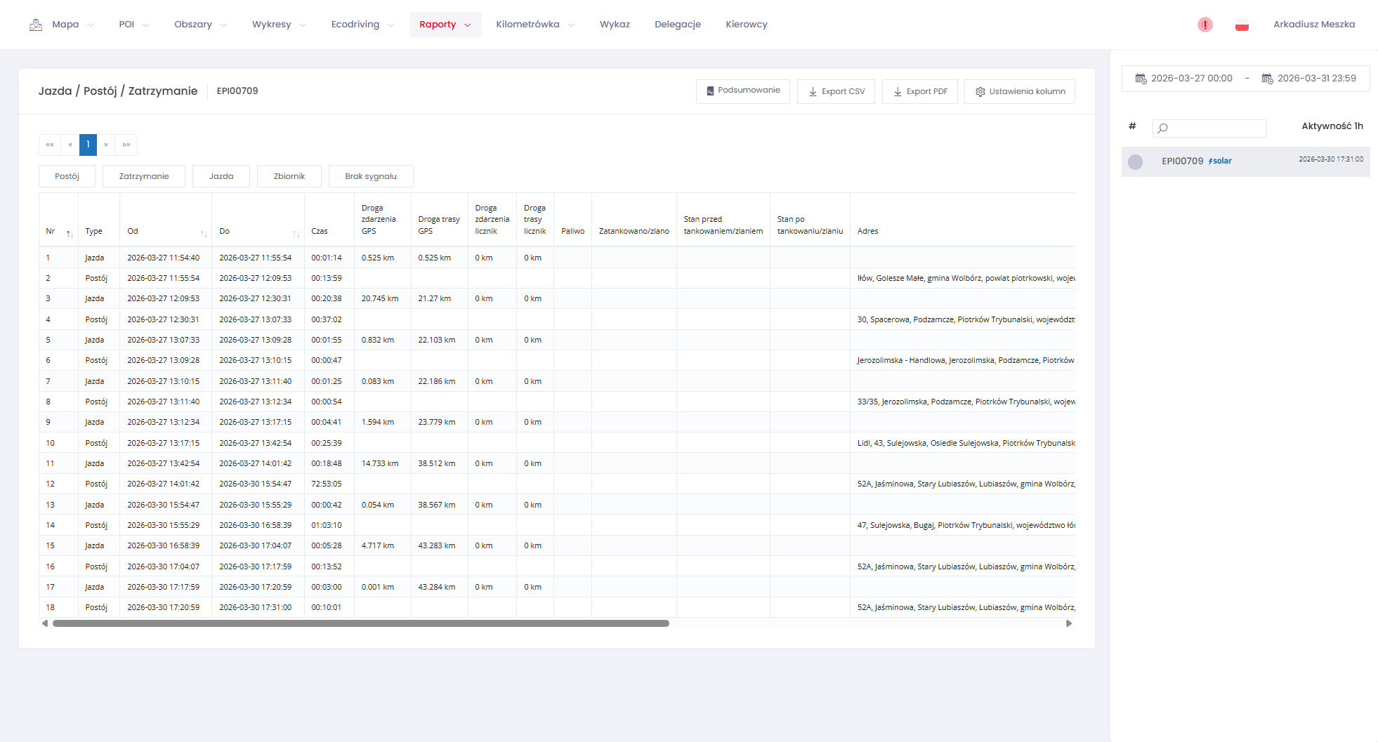 Raporty jazda — postójSzczegółowa analiza aktywności