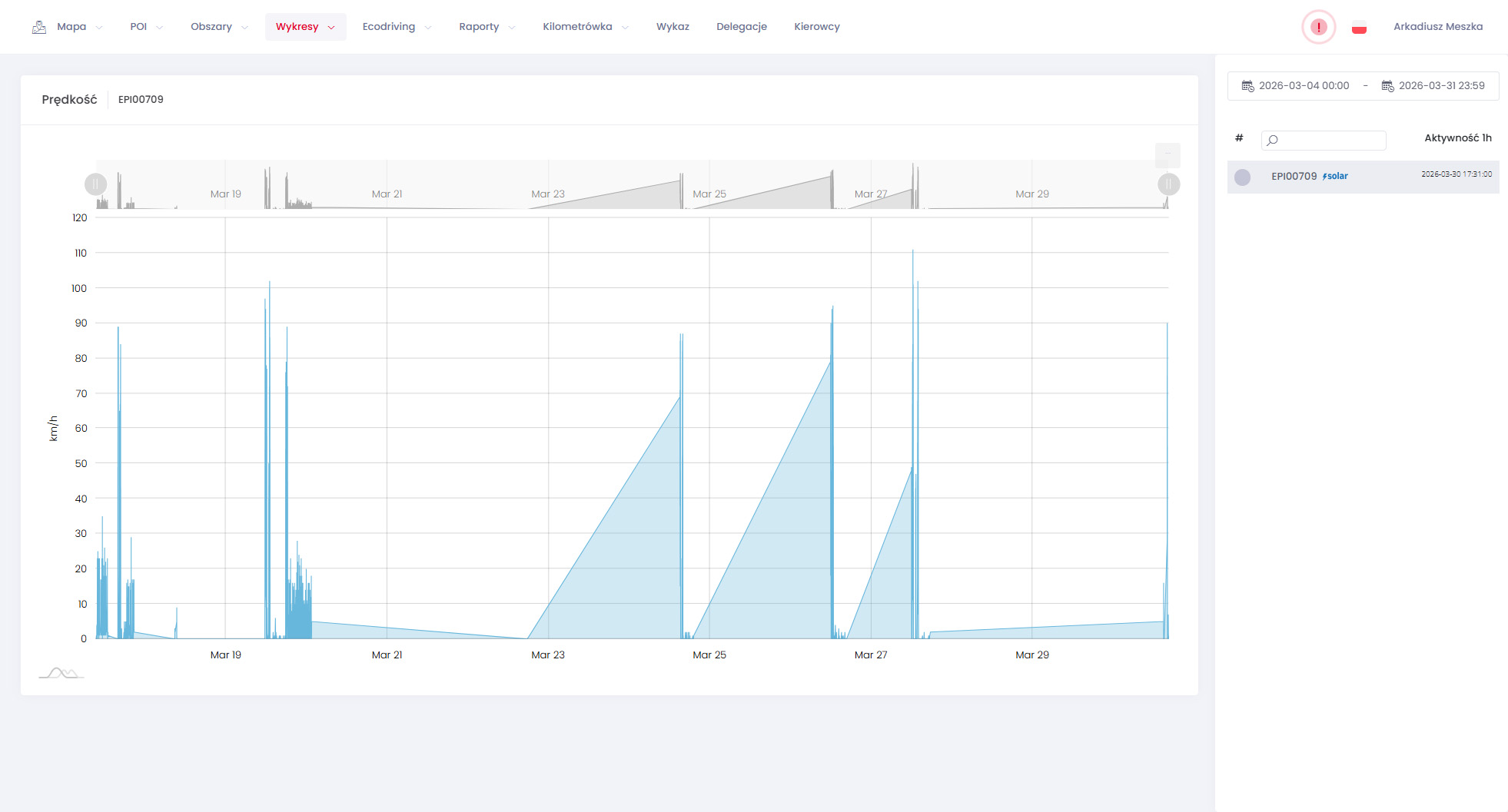 Wykresy prędkości prezentują profil jazdy kierowcy w czytelnej formie graficznej. Na osi czasu widzisz dokładnie, kiedy pojazd przyspieszał, zwalniał, stał w korku lub jechał z nadmierną prędkością.