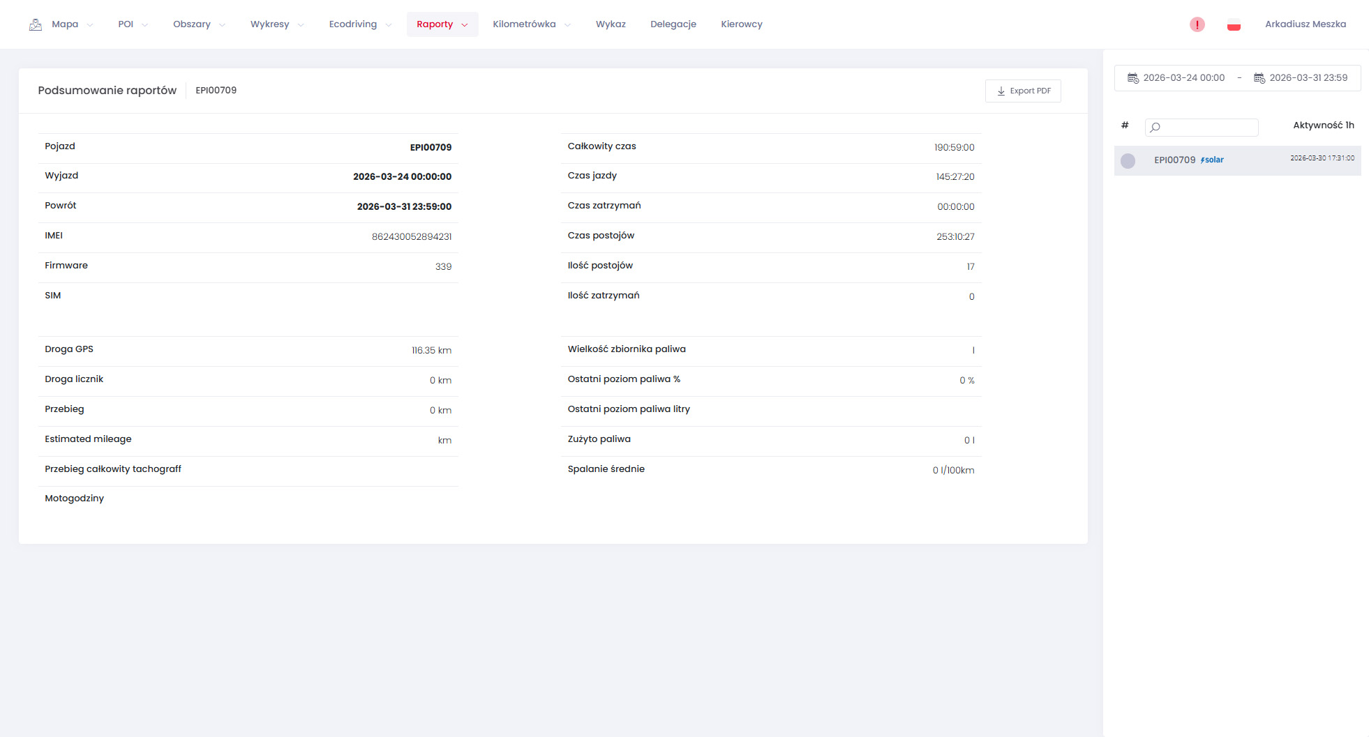 Tak. Wszystkie raporty — w tym kilometrówki, zestawienia przebiegów, raporty paliwowe i analizy czasu pracy — można eksportować do formatów Excel (XLS) i PDF. Raporty generowane są automatycznie lub na żądanie, z możliwością filtrowania po datach, pojazdach i kierowcach.